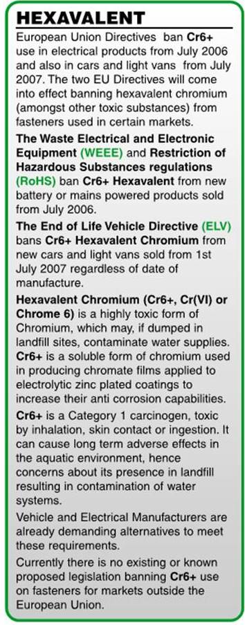 Chromate passivation on top for electroplated fastener finishes is effected by legislation, as the hexavalent is fazed out the issue of cross contamination still exists