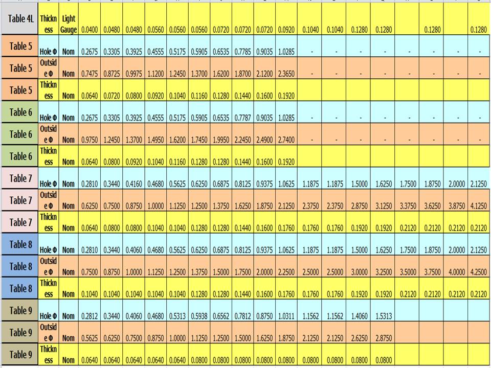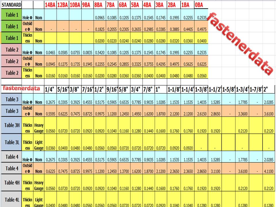 BS3410 flat washer comparisons, table one and two covering small BA sizes. Inch size flat washers from 1/4" and above, from table 3 to table 9 with heavy and light choices for table three and table four.