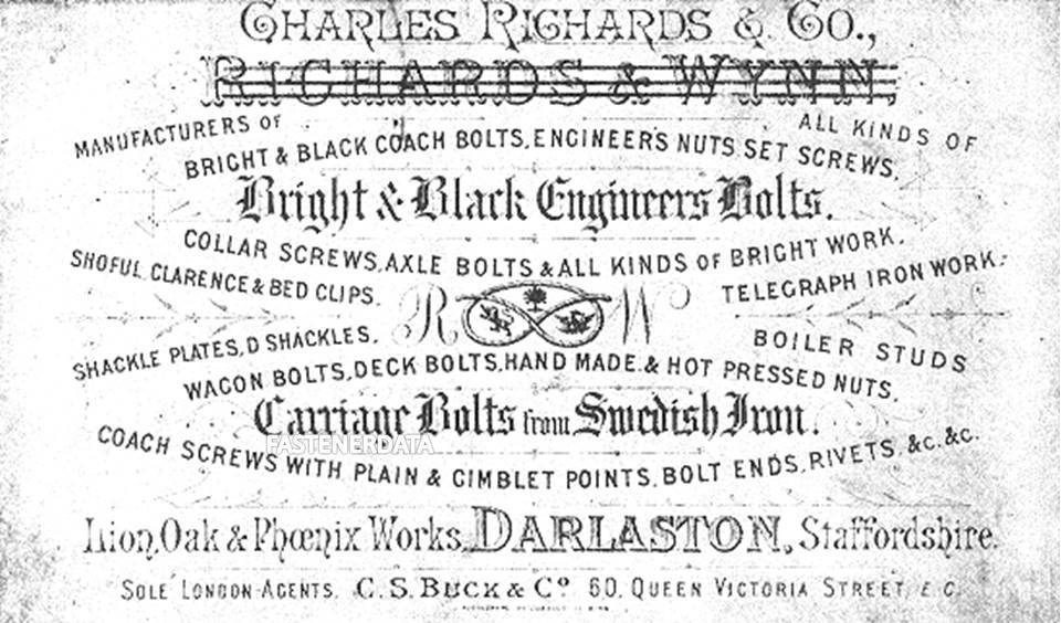 After several years William Butler left the company and Charles Richards went into partnership with Mr Wynn. The firm became known as Richards and Wynn and produced a much wider range of products including bright and black engineer's bolts, coach bolts, nuts and set screws, collar screws, axle bolts, bed clips, boiler studs, shackle plates, "D" shackles, carriage bolts, deck bolts, handmade hot pressed nuts, bolt ends and rivets, and telegraph ironwork.
